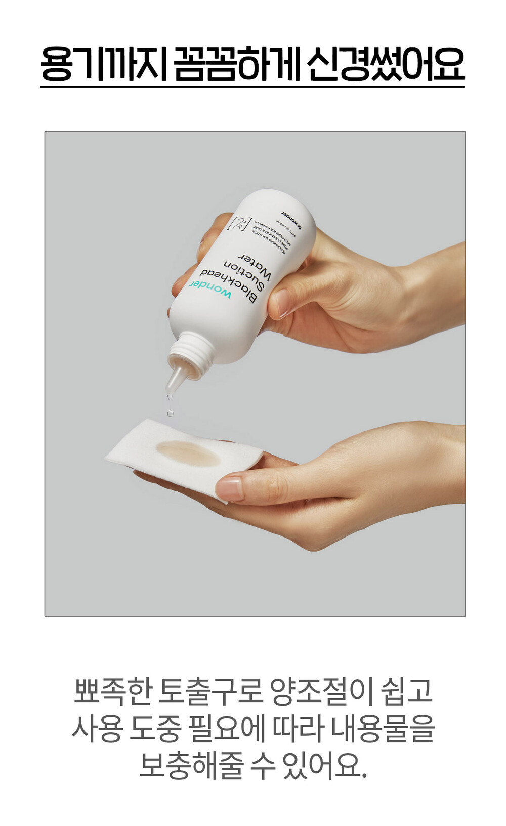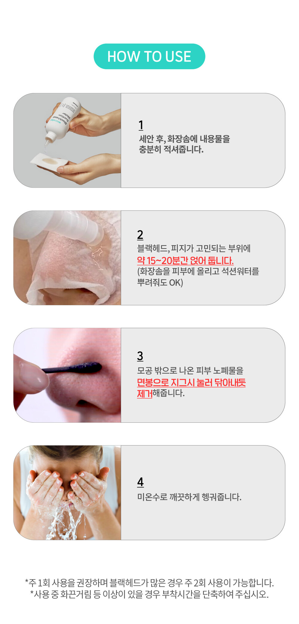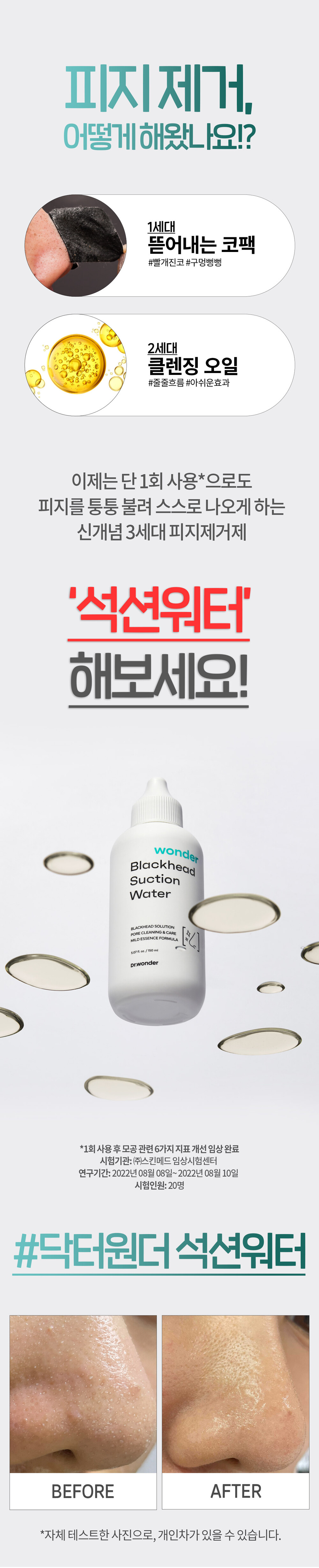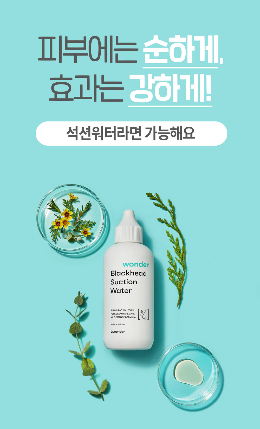 블랙헤드 석션워터는 단 1회 사용으로도 피지를 불려 스스로 나오게 하는 신개념 3세대 피지제거제입니다.