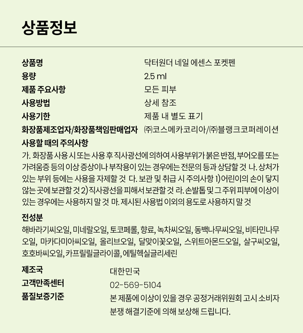 네일 에센스 포켓펜은 바를수록 튼튼해지는 노란빛깔 네일 에센스입니다. 에센스 포켓펜 하나로 맨 손톱을 촉촉하고 활력있게 가꿔보세요!