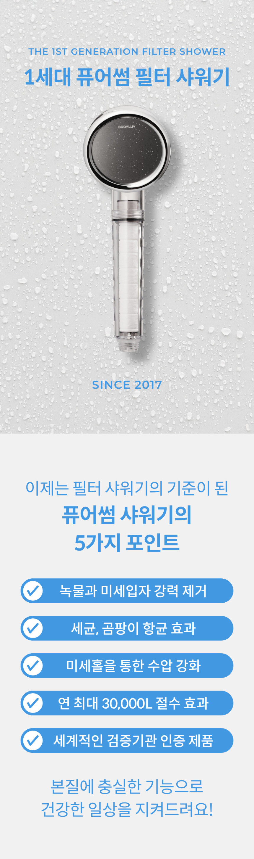1세대 퓨어썸 필터 샤워기는 수돗물 속 녹물과 불순물을 제거하여 깨끗한 물을 사용할 수 있도록 도와줍니다.