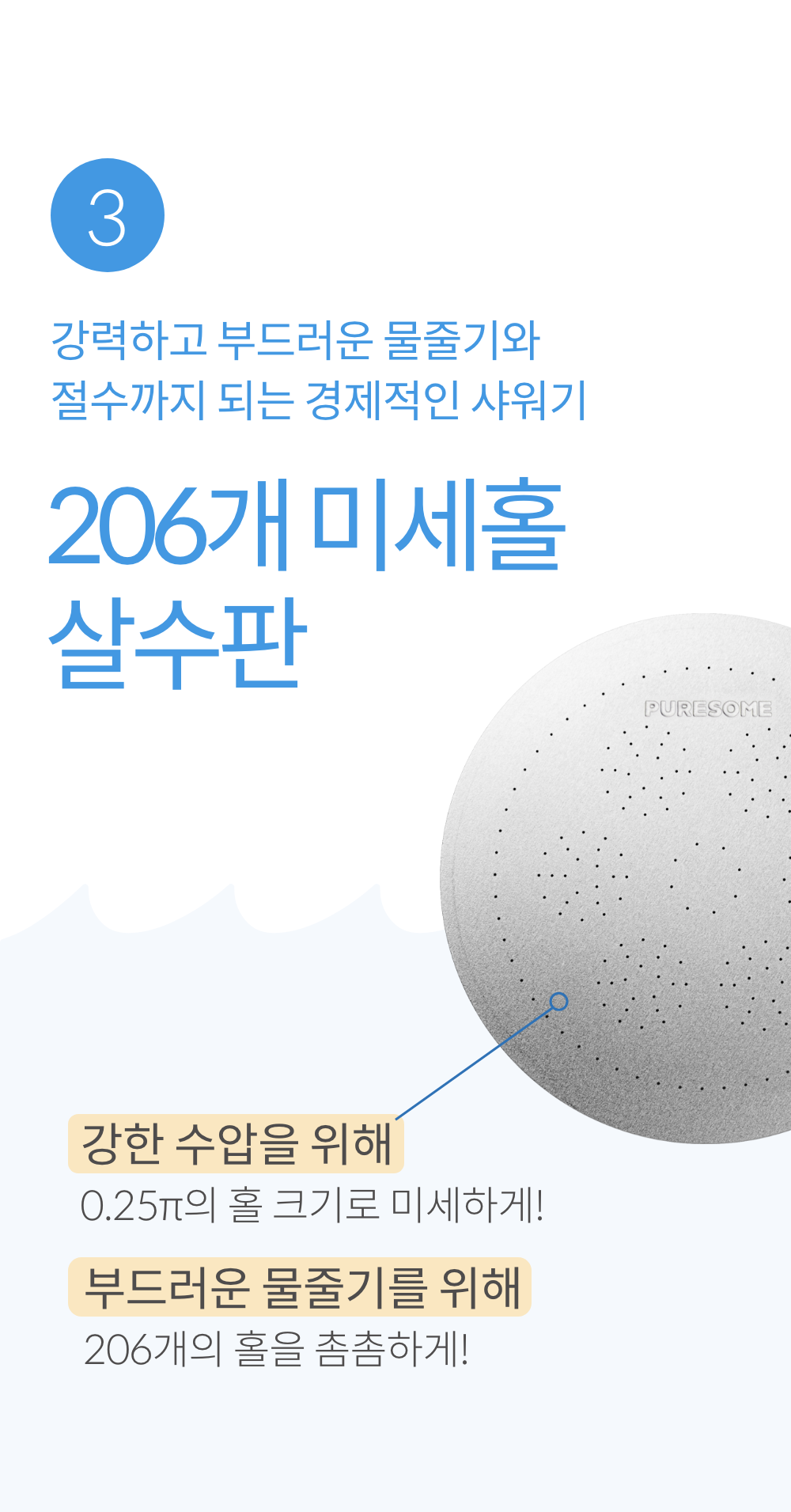 ③ 206개 미세홀 살수판으로 강력하고 부드러운 물줄기와 절수까지 되는 경제적인 샤워기