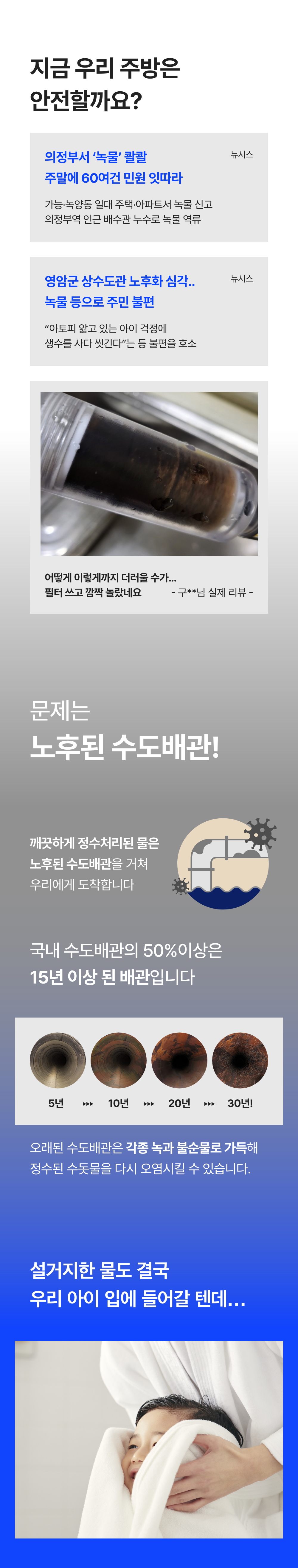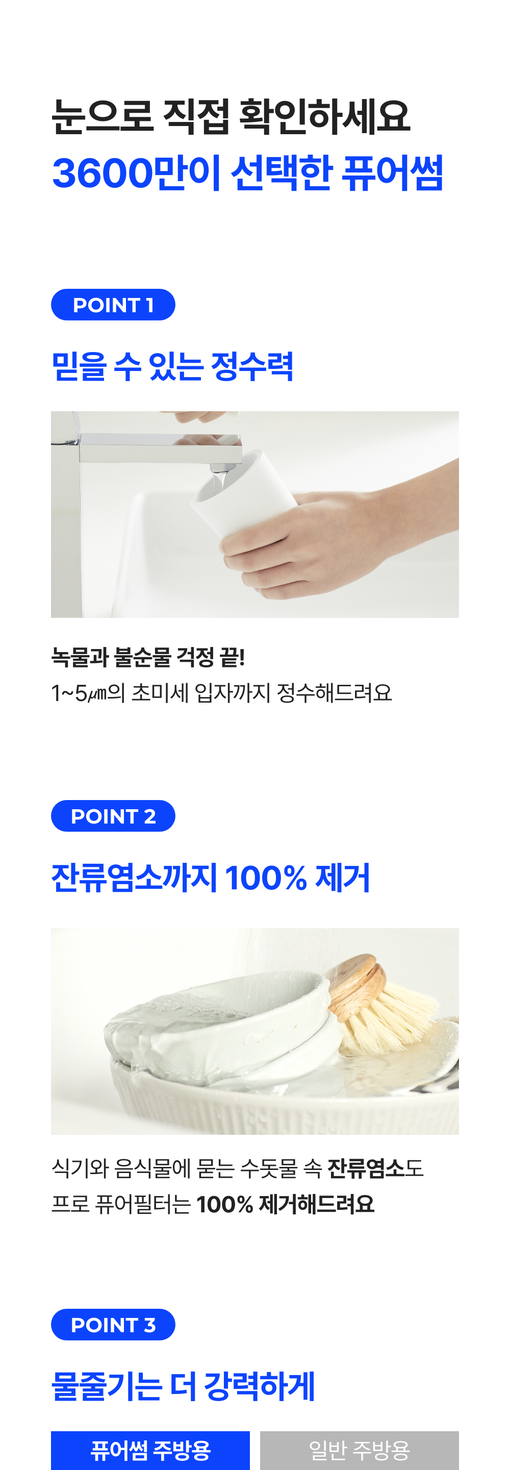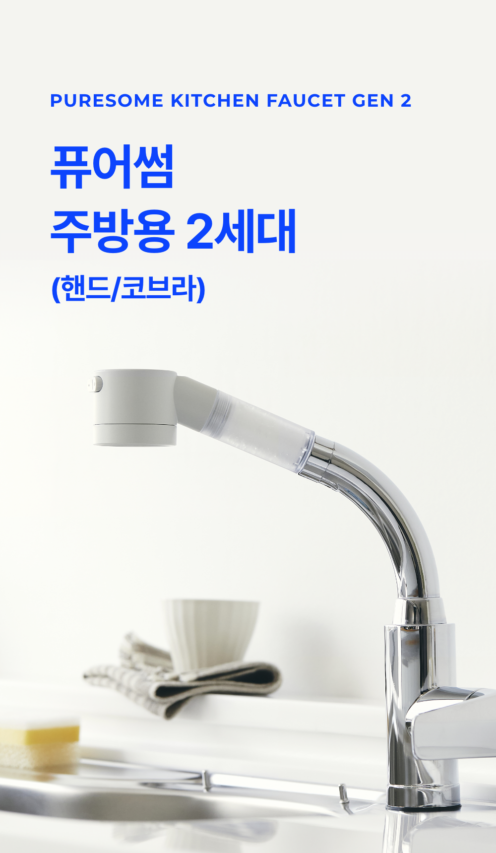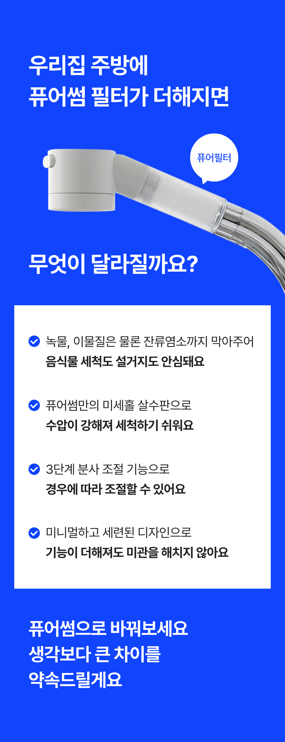 녹물, 불순물, 잔류염소까지 확실하게 제거해주는 퓨어썸 주방용 필터! 이제 주방에서도 안심하고 사용하세요.