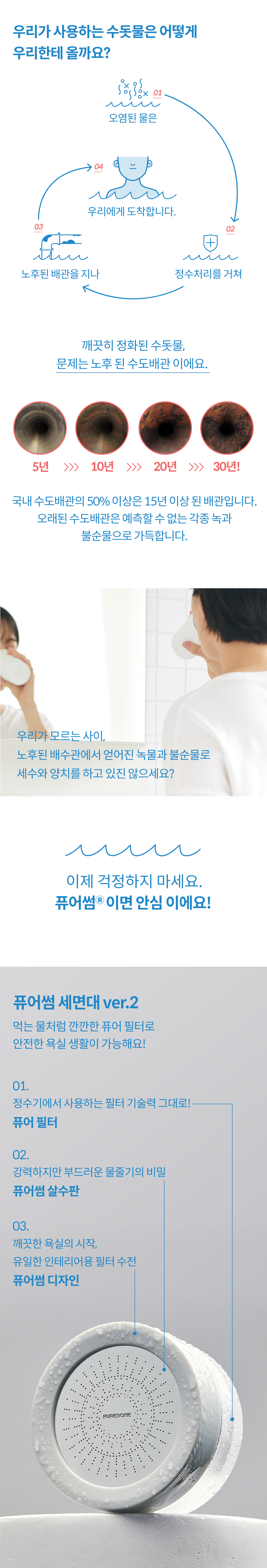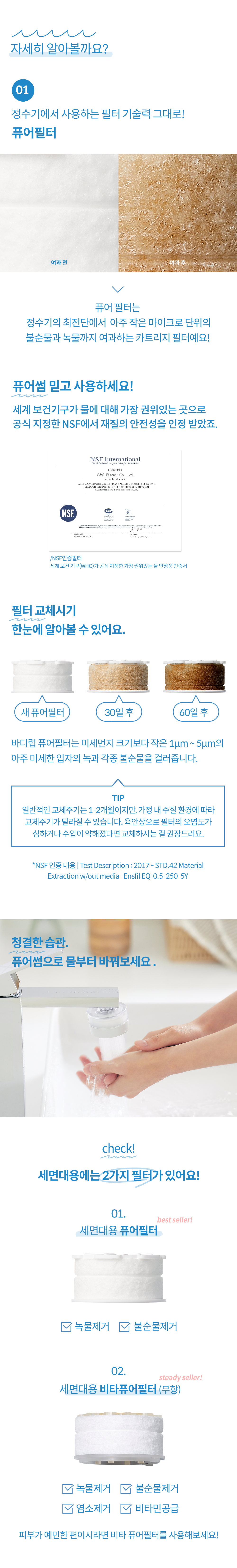 2세대 퓨어썸 세면대용은 먹는 물처럼 깐깐한 퓨어필터로 안전한 욕실 생활을 가능하도록 도와줍니다.