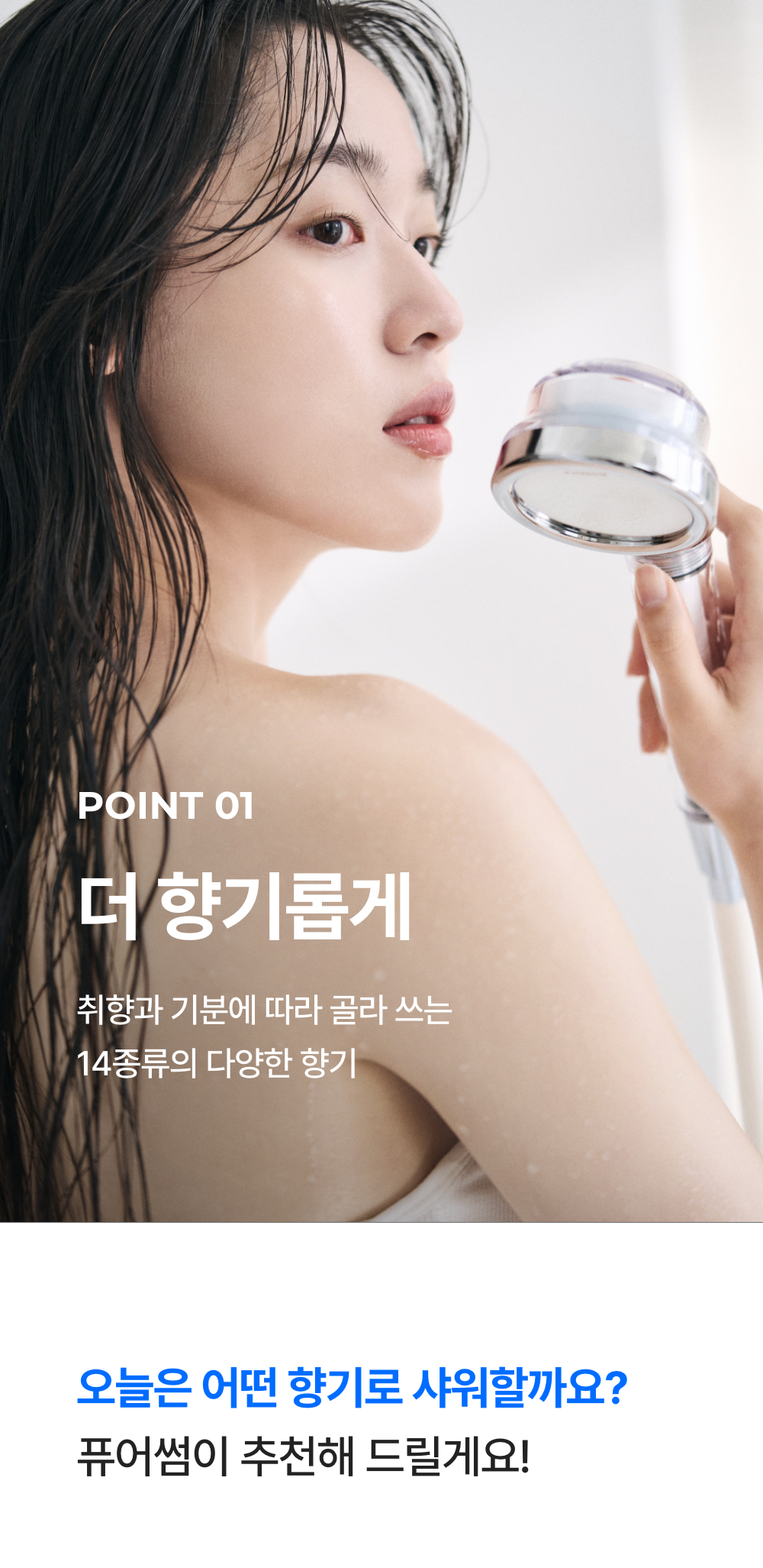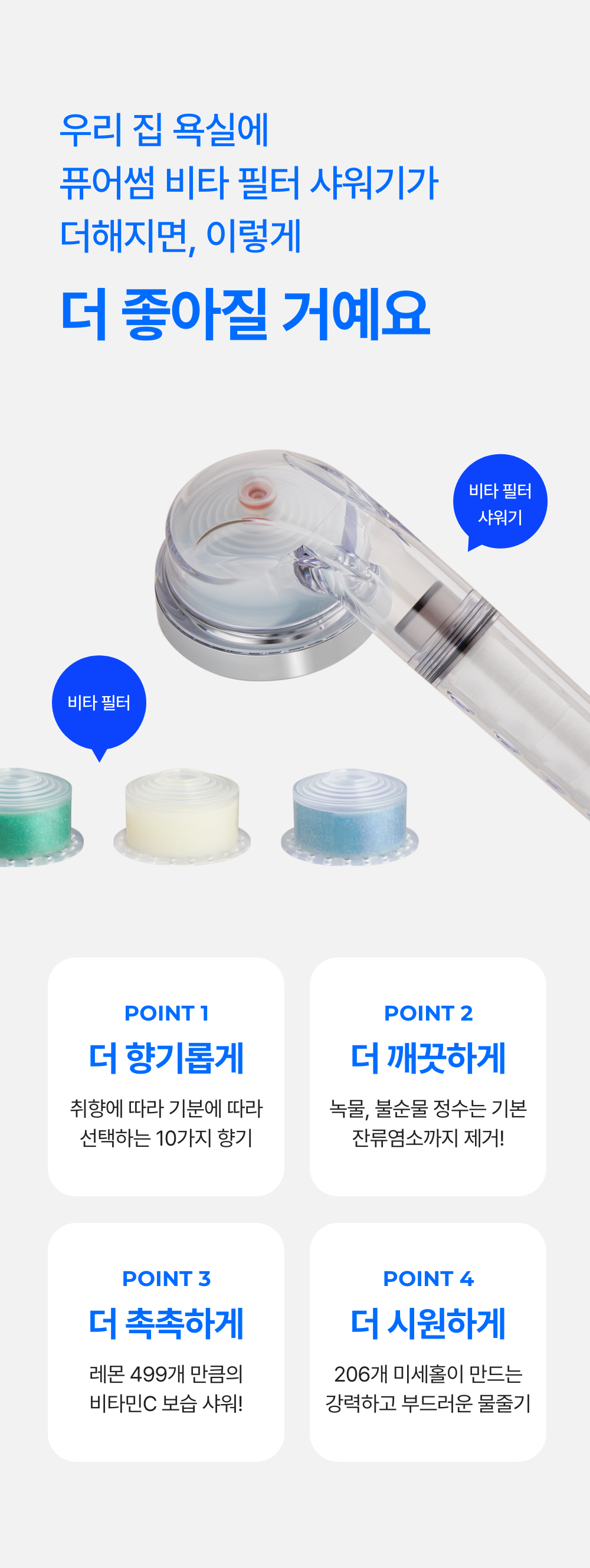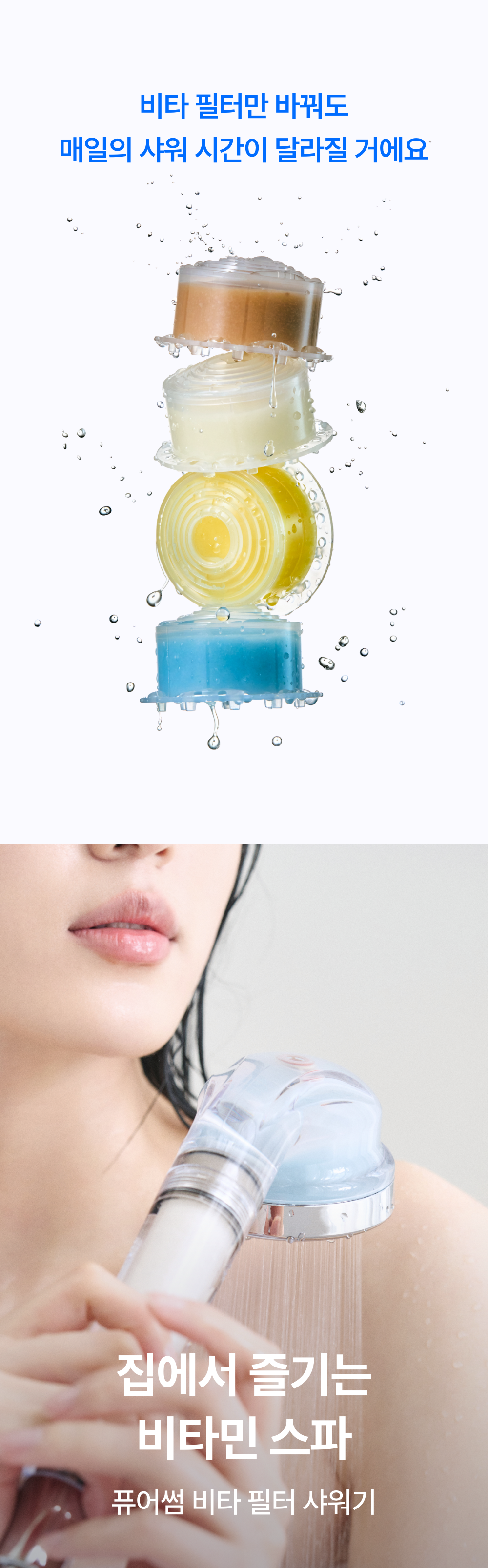 퓨어썸 비타필터는 녹물과 불순물 정수 및 잔류염소를 제거해주어 깨끗한 물을 사용할 수 있게 도와주며 10가지 향기가 있어 취향에 맞게 골라 사용할 수 있습니다.