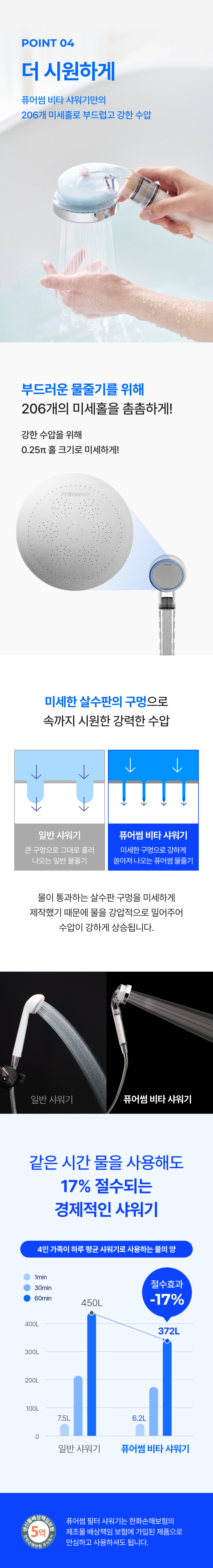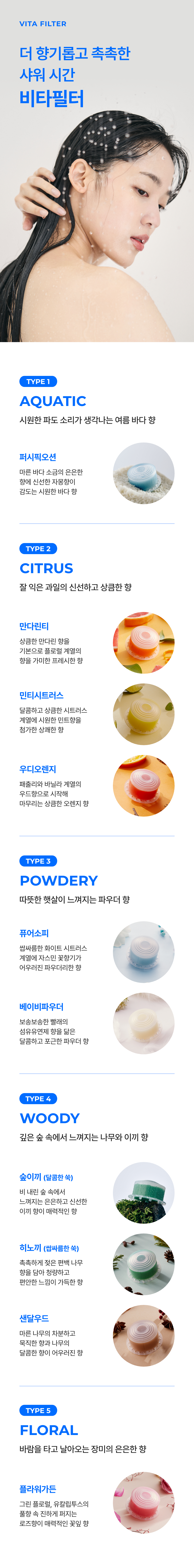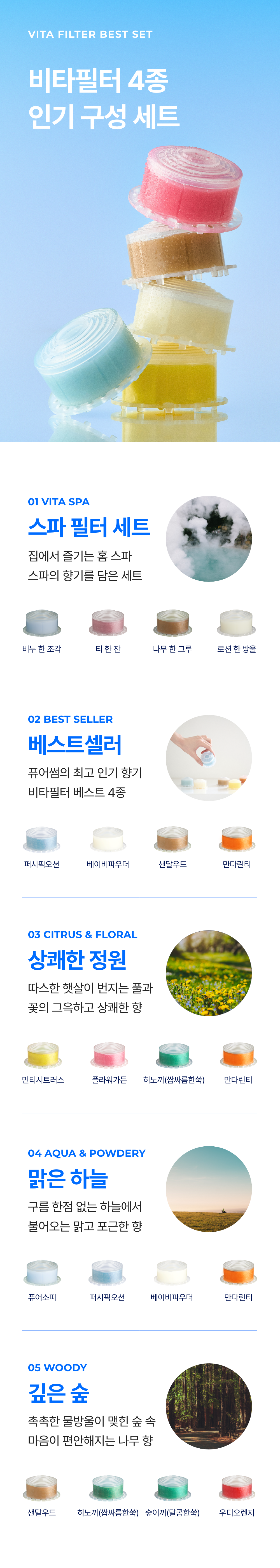 퓨어썸 비타필터는 녹물과 불순물 정수 및 잔류염소를 제거해주어 깨끗한 물을 사용할 수 있게 도와주며 10가지 향기가 있어 취향에 맞게 골라 사용할 수 있습니다.